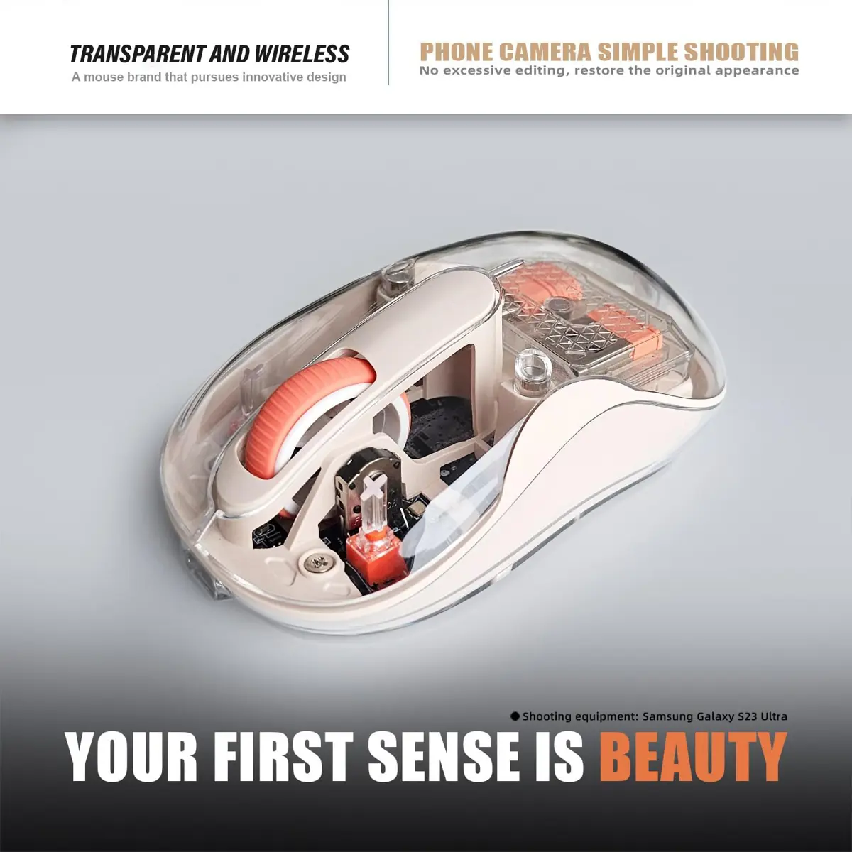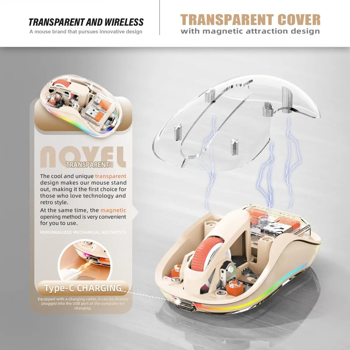 Beautiful Transparent Wireless Mouse, Dual Bluetooth & 2.4GHz for Multi Device, USB-C Receiver Ideal for MacBook/Laptops, Rechargeable, Cool LED - Cream