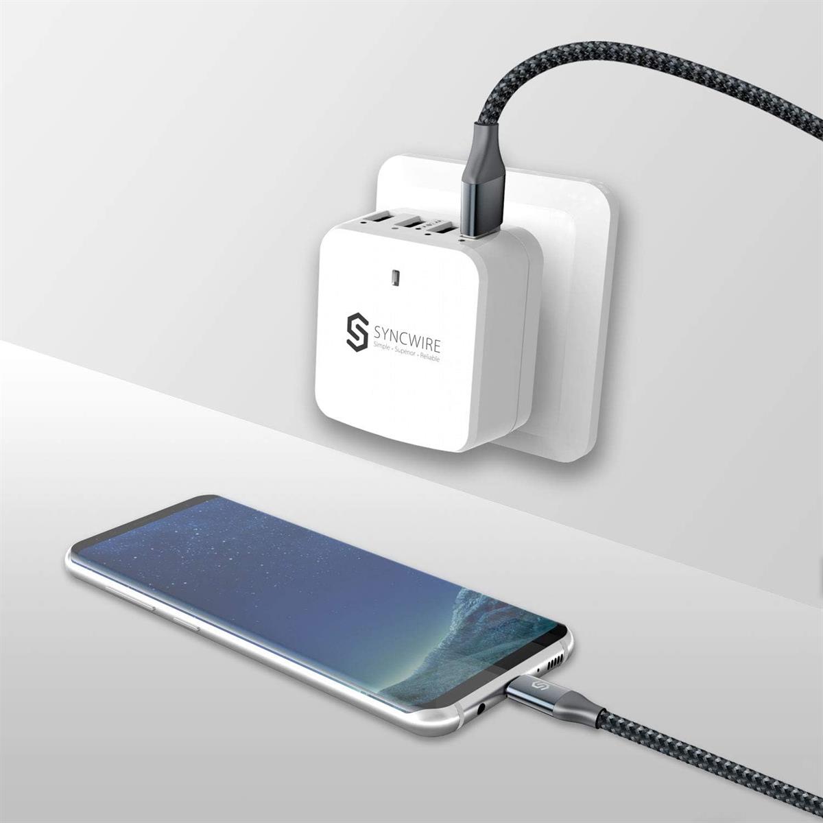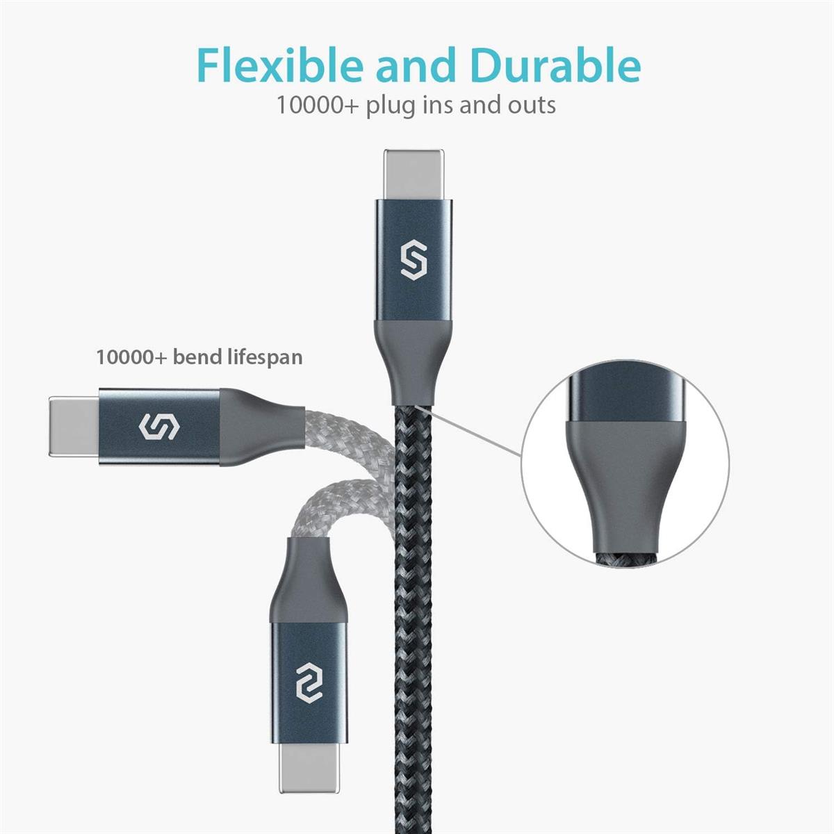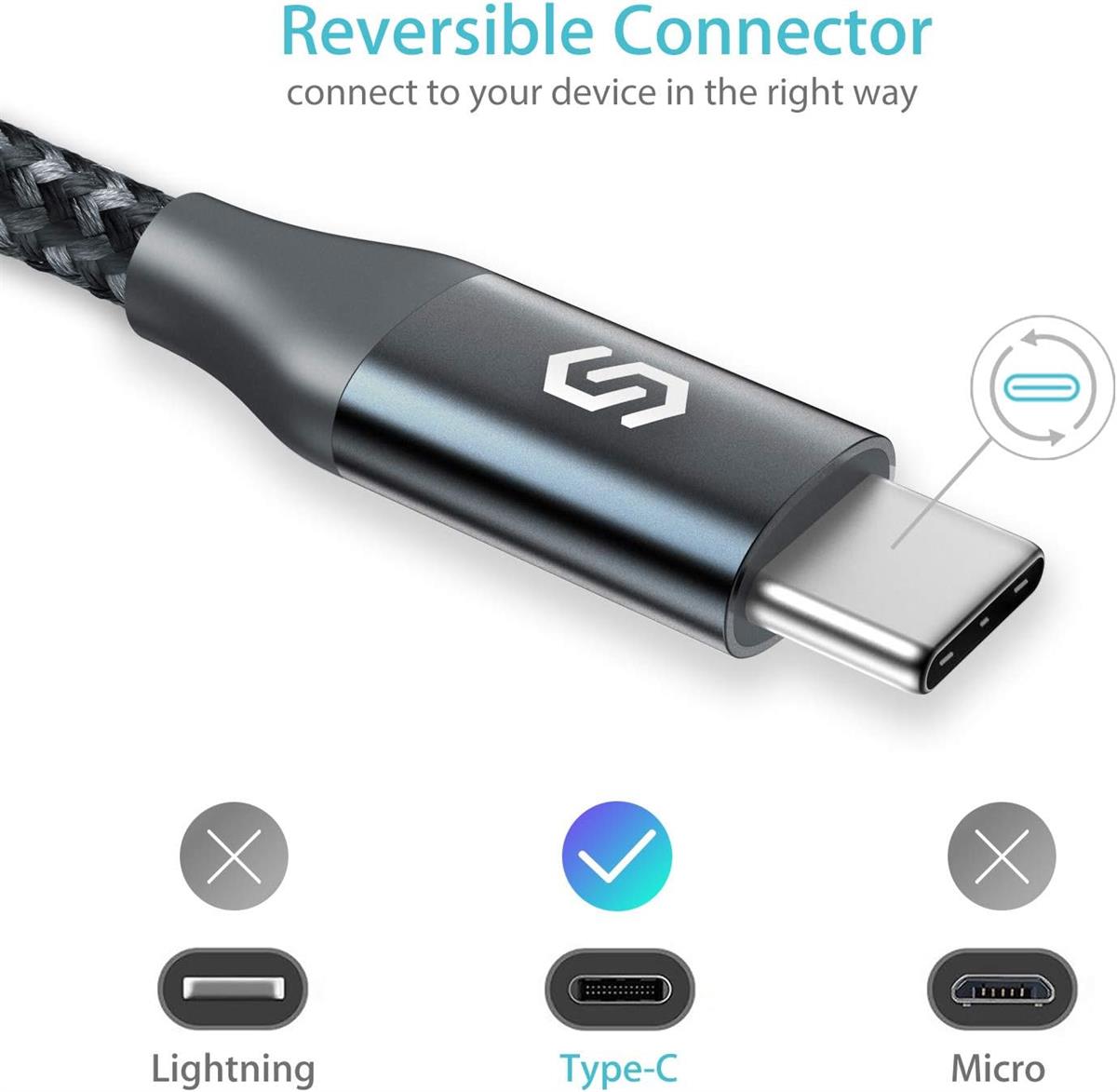 Syncwire Type-C cable is built to last. Encased in aluminum shell, the reversible USB-C connector is strong enough to withstand 8 kg exterior force without breaking off, not to mention falling off while being unplugged. Thus, you can always expect a perfect connection without worrying about a loose connection or a bent tip.