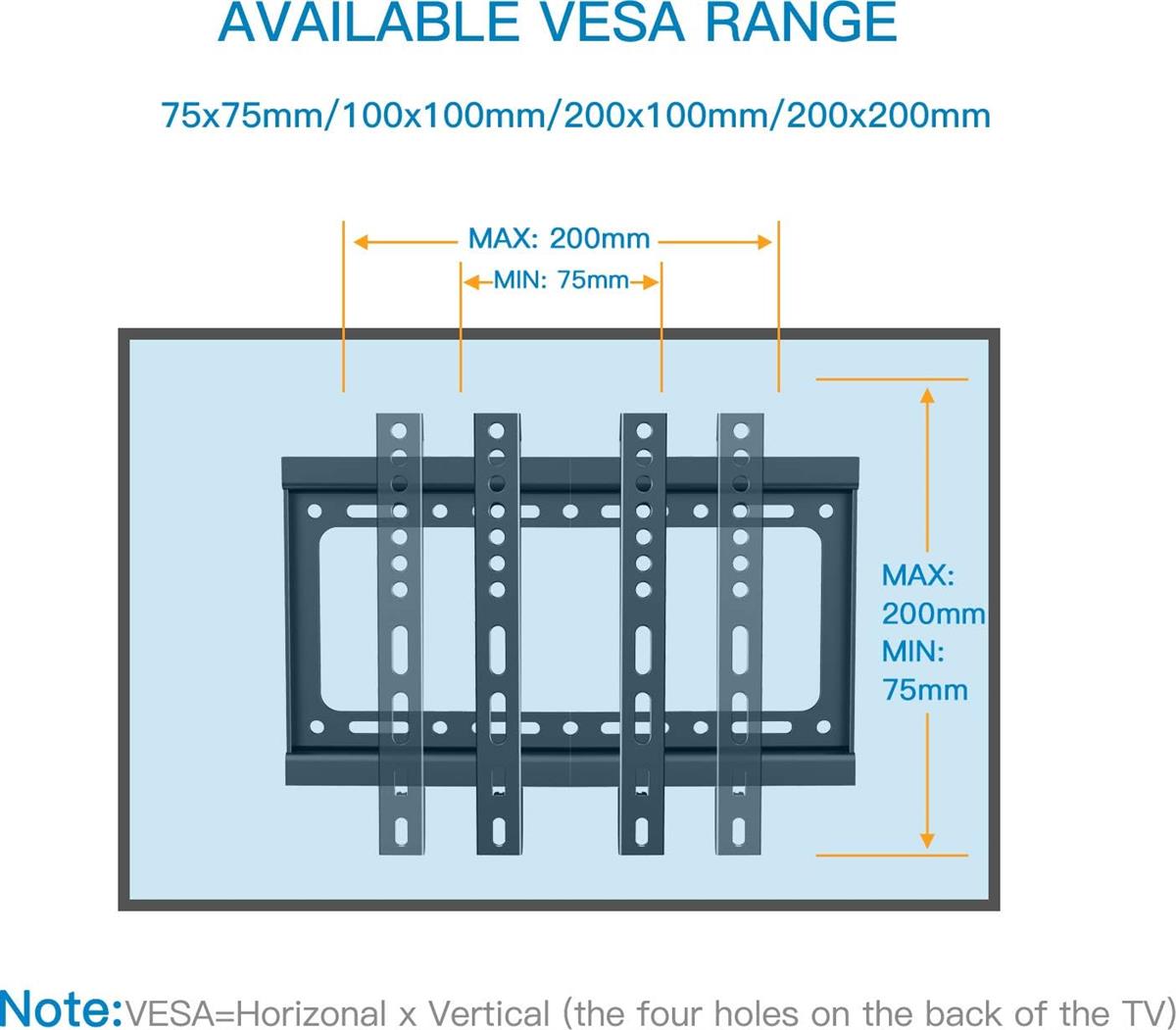 Our Fixed TV mount has a compatible faceplate that fits VESA 75x75mm (3"x3"), 100x100 (4"x4"), 200x100 (8"x4"), 200x200mm (8"x8"), so the mounting holes distance on the back of TV must be less than 8" (200mm) horizontally and 8" (200mm) vertically. Please check whether the TV mount is compatible with your 17”- 39” TVs and the weight of your TV should be 66lbs or lower.