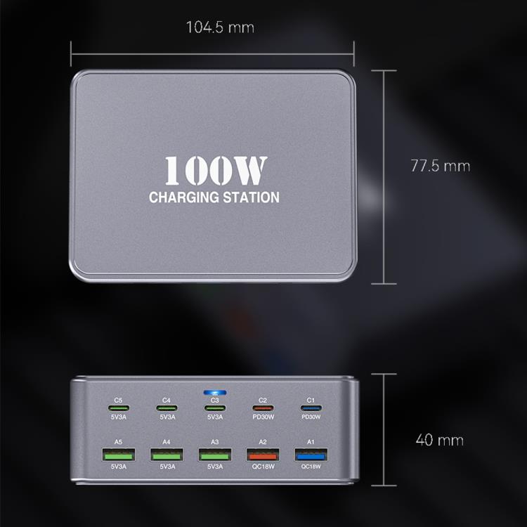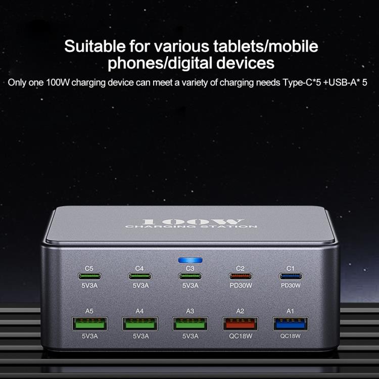 HW33 100W Type-C + USB 10-Port Desktop Fast Charger, Plug Type:UK Plug